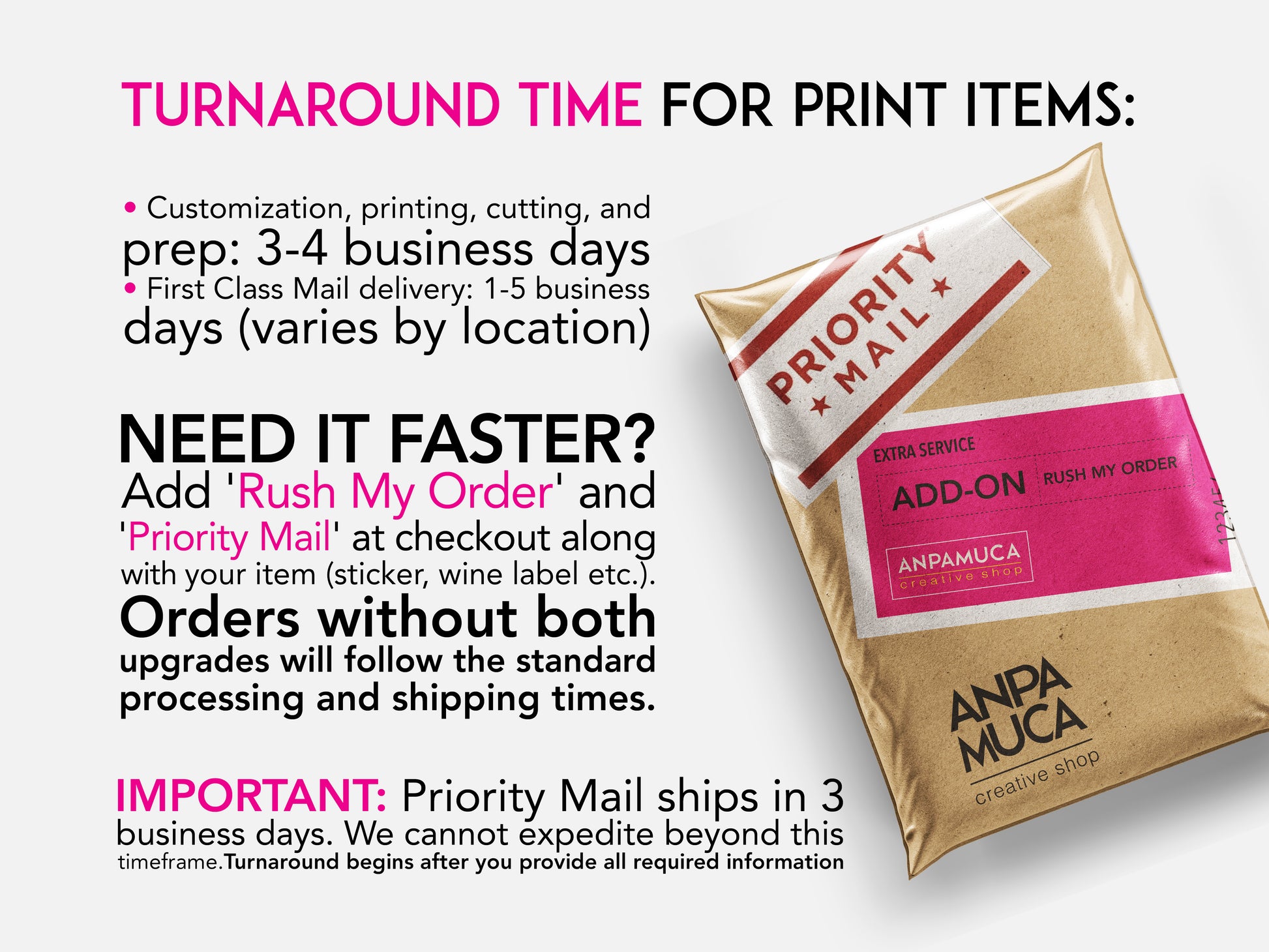 🌸 Printed Wine Labels – 2-3 business days for personalized design and production, plus 1 additional day for shipping your wine bottle stickers.