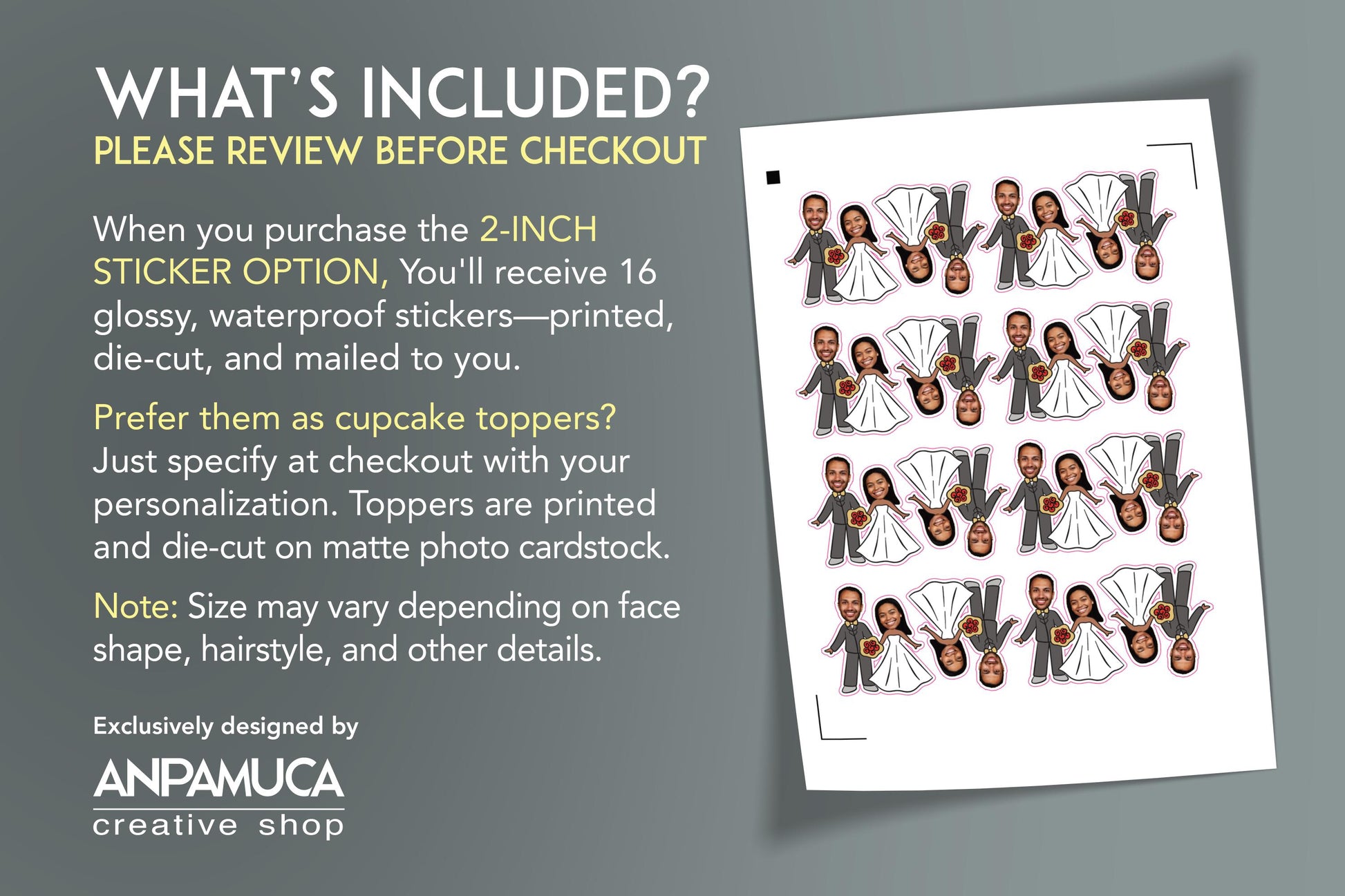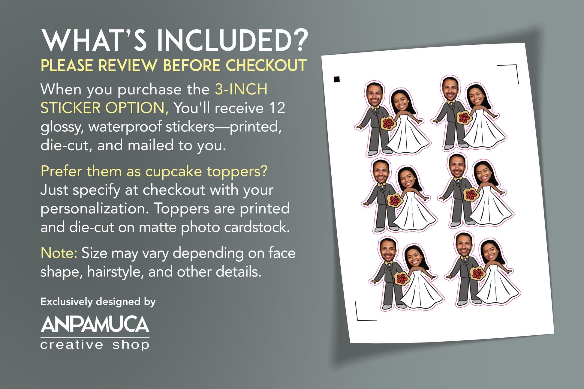 Custom bride and groom face stickers for wedding decorations, bridal shower favors, and bachelorette party labels. Funny wedding cake topper stickers available as digital download or printed party favors. ***If you choose digital, note that NO physical product will be shipped.