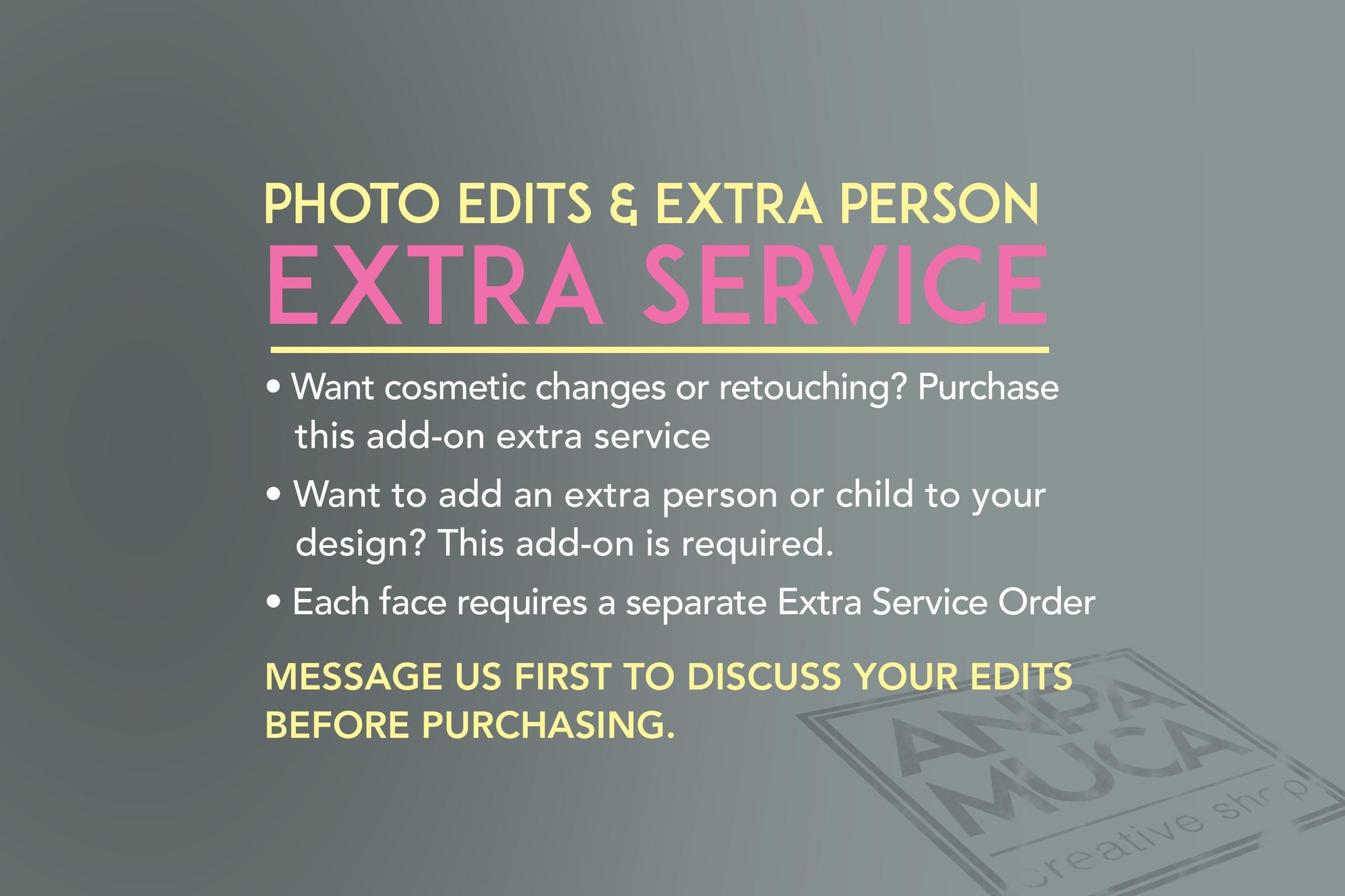 š Want cosmetic changes or retouching? Purchase this add-on.